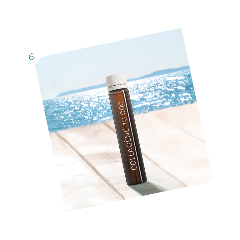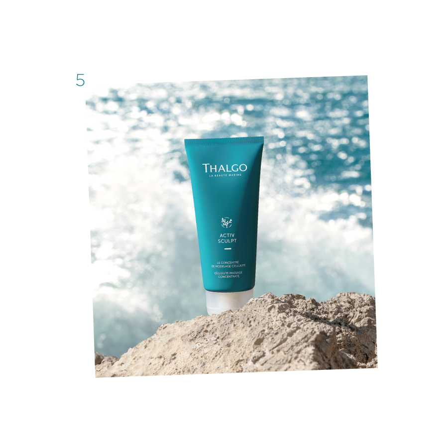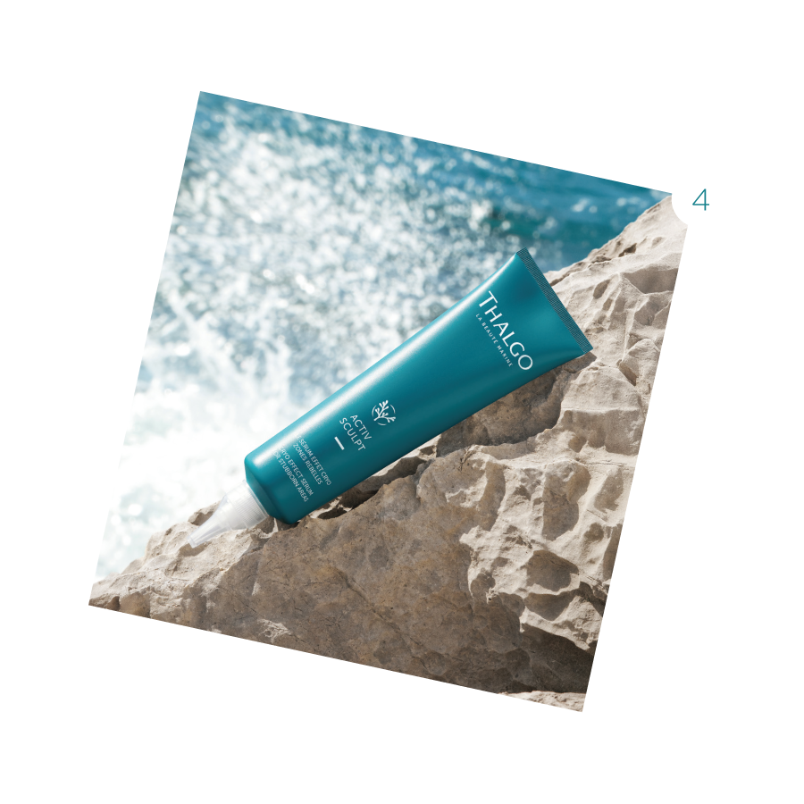 Para continuar o cuidado em casa, a Thalgo propõe o Collagène 10 000 (6), um suplemento intensivo de colagénio marinho que ajuda a reforçar a estrutura da pele e a combater a flacidez. O protocolo é complementado pelo Crème Performance Fermeté (7), um cuidado corporal refirmante que atua sobre a elasticidade da pele e ajuda a remodelar a silhueta.