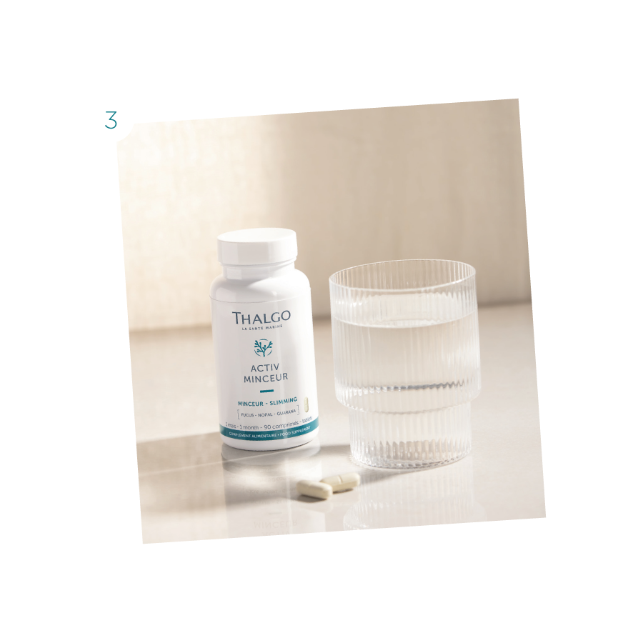 Em casa, esta etapa começa com os suplementos Activ Draineur (2) e Activ Minceur (3) que contribuem para estimular a drenagem e apoiar o processo de adelgaçamento. Para complementar, o Sérum Effet Cryo Zones Rebelles (4) atua nas zonas de gordura localizada para eliminar gordura, e o creme Concentré de Modelage Cellulite (5) ajuda a reduzir visivelmente a celulite e a melhorar a textura da pele.