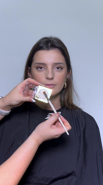 Aplicamos iluminador nas maçãs do rosto para um acabamento radiante e saudável.