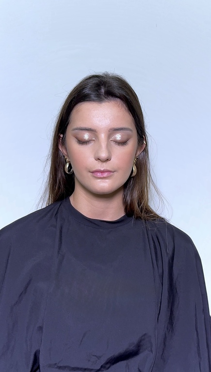 Aplicamos o produto luminoso no centro da pálpebra, criando um ponto de luz que abre e destaca o olhar.